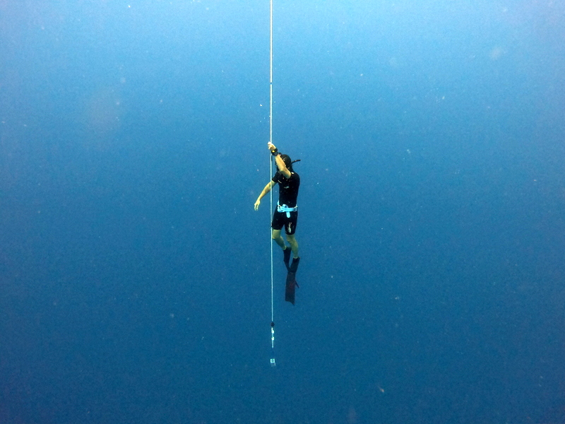 В-третьих, положительная плавучесть должна быть у фридайвера при всплытии с 7-8 метров. Чаще всего потеря сознания случается на всплытии, таким образом важно чтоб на крайних метрах дистанции фридайвер мог немного подсэкономить энергии и не работать очень активно, дабы избежать резкого снижения кислорода в крови.