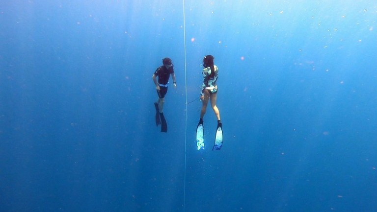 Проще говоря, положительная плавучесть – это когда фридайвер всплывает с, допустим, 5 метров не прилагая к этому никаких усилий. Ну, а если фридайвер на тех же 5 метрах «зависает», не двигаясь ни вниз, ни вверх, значит, на данной глубине у него нейтральная плавучесть. Это ощущение, скорее всего, похоже на чувство невесомости при отсутствии гравитации. Многие дайверы сравнивают зависания с пребыванием в космосе. В Космосе, конечно же, никто из фридайверов не был. Пока что. Но если верить описаниям и документальным хроникам – именно так все там и происходит. Отрицательная плавучесть – это когда фридайвер сначала медленно, а потом все быстрее, опускается вниз без каких-либо усилий. Это явление называется фрифол – свободное падение. Для большинства людей, подсевших на погружения именно фрифол становится тем самым любимым ощущением, за которым хочется возвращаться снова.
